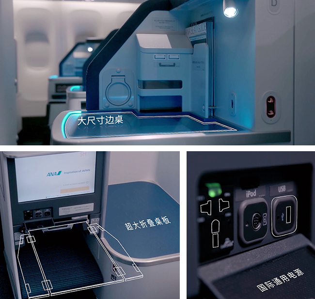 大尺寸边桌,超大折叠桌板、阅读灯、以及国际通用电源和USB接口,为您提供完备的办公环境。