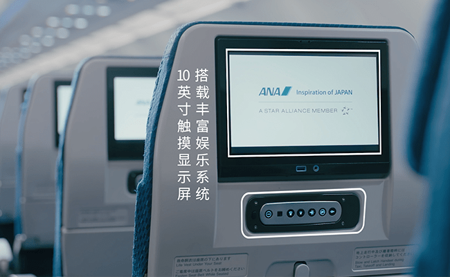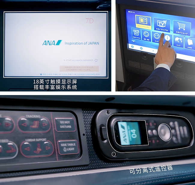 18英寸大型触摸显示屏搭载最新热门电影、ANA原创节目以及各种音乐歌曲,可分离式摇控器,带给您更多的旅程娱乐。